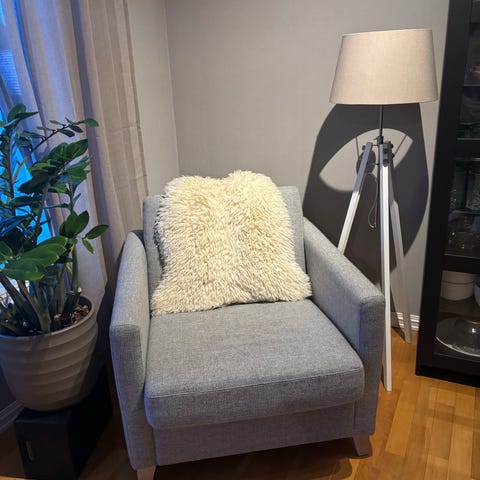 Lenestolen har naturlig slitasje i skinnet (se bilder), men er fortsatt i god og brukbar stand. Stabil fot i tre gir et klassisk og tidløst uttrykk. Må hentes.