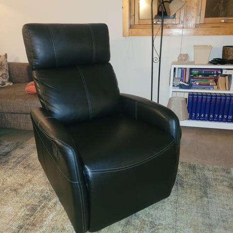 Selger en komfortabel og solid lenestol i brunt skinn. Stolen er svært god å sitte i, med høy rygg og brede armlener – perfekt til stue, lesekrok eller TV-rom.