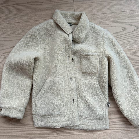 ONLY jakke til jente i størrelse 134. Jakken er grå og laget i polyester med myk, pelsliknende overflate. Den har krage, glidelåslukking foran og to glidelåslommer.