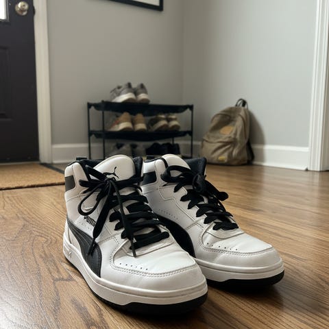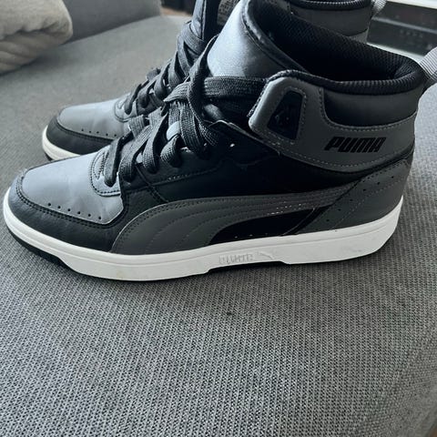 Puma sneakers joggesko i størrelse 41. Modellen er en høy variant med snøring. Skoene har overdel i syntetisk materiale og tekstil med fargene hvit, svart og rød. Yttersåle i gummi. Egnet som fritids- og hverdagsko.