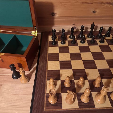Her får du et elegant og solid sjakksett i tre med sammenleggbart brett (ca. 40x40 cm).