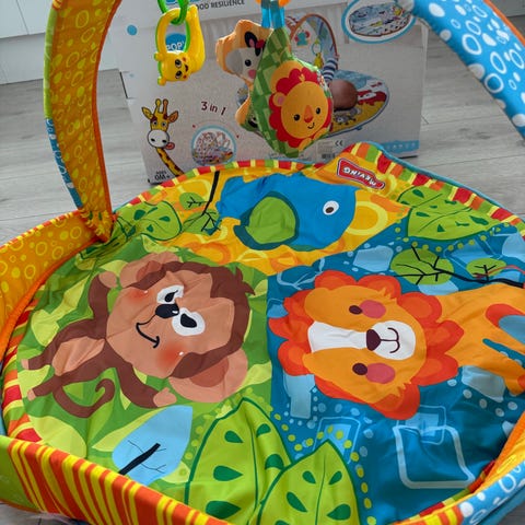 Den inkluderer også en lekesløyfe med fargerike leker som dingler over barnets hode. Disse lekene kan fjernes og brukes separat for ytterligere lekemuligheter. Følger med noen ekstra leker.