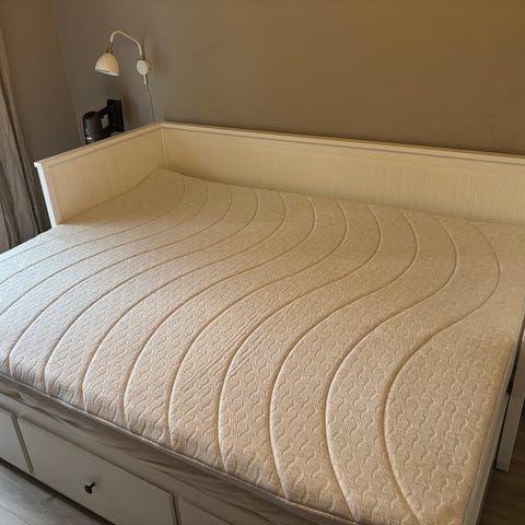 3 år gammel, kun brukt 10 netter. Passet dårlig til to rammemadrasser fra IKEA. Passer best til seng med liten/ingen glippe i midt.
