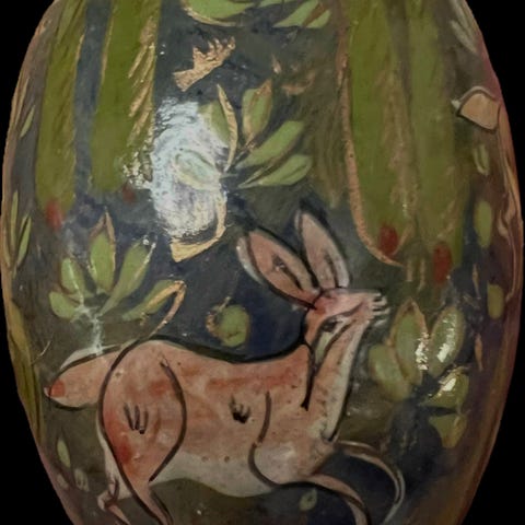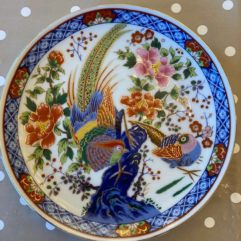 Dekorativ egg i porselen med blå bakgrunn og motiv av fugler og blomster i flere farger. Står på en rund sokkel i tre eller treimitasjon. Egner seg som på bord, hylle eller nattbord i stue, stue eller gang.