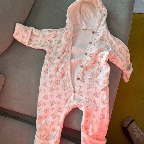 Lil'Atelier babydress med hette i størrelse 62/68 unisex. Heldressen er i hvit bomull med blomsterprint og har lange ermer og ben. Lukkes med knapper foran. Mykt, helfôret innerlag i bomull gir ekstra komfort. Ble brukt av baby forrige høst før det ble minusgrader. Passer perfekt nå til våren når det blir litt mildere igjen. En veldig myk og behagelig dress.