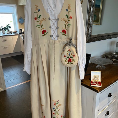 Bergensbunad i hvit med veske og kep. Str m-L. Men kan nok sys inn. Høyde ca 164. Ingen flekker. Skjorte følger med.