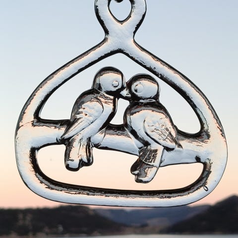 Herlig Glassoppheng / solspreder / solfanger med motiv av to fugler/turtelduer som sitter på en gren og kysser. Utført i klart glass med opphengsøye øverst, egnet til å henge i vindu eller på vegg. Dekorativt objekt som slipper lys gjennom og fremhever motivet når det henger foran et vindu. Fra svenske Kosta Boda, 70-tallet, formgitt av mesteren Bertil Vallien. Den fine solfangeren gnistrer i vinduet eller ute på balkongen! Ingen nagg eller skader.