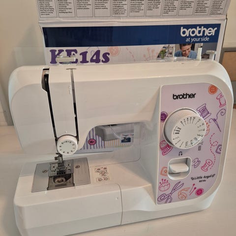 Den syr litt trått i tjukkere stoff og har litt trøbbel med å spole opp undertråd. Spoling av undertråden har eg løyst med å ta tråden to gongar rundt eine punktet ein trer tråden og det funkar veldig bra.