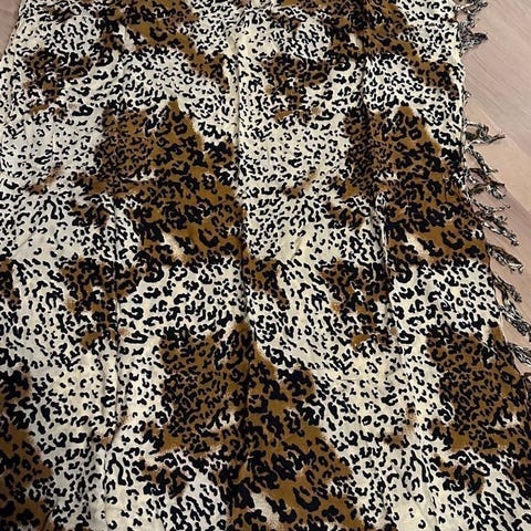 Lite brukt, lagt mest i en skuff. Helt inn med dyreprint, så dette setter prikken over antrekket. Str. 86x86 cm. 100% silke.