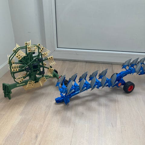 Bruder leker traktor og landbrukskjøretøy sett. Inneholder flere landbruks- og anleggskjøretøy i plast, blant annet grønn traktor med tilhenger og plogskjær, grønn landbruksmaskin, rød og svart gaffeltruck, samt to figurmenn. Kjøretøyene har bevegelige deler som skuffer, gafler og tilhengerdel.