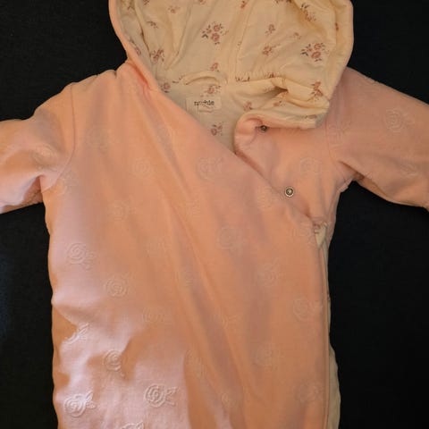 Lil'Atelier heldress for baby i størrelse 62/68. Heldressen er hvit i bomull med blomstermønster og har hette. Den har lange ermer og ben, samt knepping foran for enkel av- og påkledning. Egnet som myk og behagelig ytter- eller mellomlagsdress til hverdagsbruk for baby. Brukt av baby i høst før det ble mange minusgrader. Passer fint nå til vår og mildere vær. En utrolig myk og behagelig dress. Ingen synlige flekker.