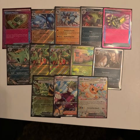 Pokémon samlekort blandet lot med 8 kort. Lotten inneholder ulike typer kort, blant annet trenerkort og Pokémon-kort i forskjellige farger/typer. Enkelte kort har holo- eller reverse holo-effekt. Egnet for samling eller som tillegg til eksisterende kortstokk i Pokémon Trading Card Game. Se bilder for oversikt over hvilke motiver og kort som følger med. 20 kr per kort