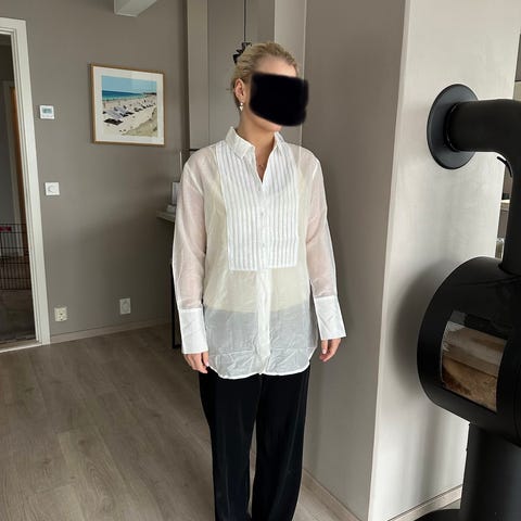 Line of Oslo skjorte for dame i størrelse XS. Skjorten er hvit og laget av bomull. Den har lange ermer, knappelukking foran og dekorative volanger langs knappestolpen. Passer til hverdagsbruk eller mer formelle anledninger, og kan kombineres med både bukser og skjørt.