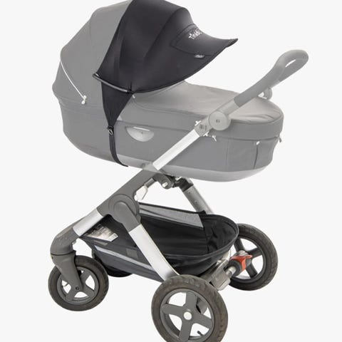 Solskjermen festes på kalesjen og gir ekstra skygge for barnet i vognen. Passer de fleste typer barnevogner med kalesje. Leveres i rund oppbevaringsveske med hank for enkel lagring og transport. Materialet er lett og fleksibelt, og kan justeres etter behov for å skjerme mot sollys.