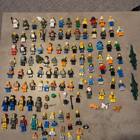 LEGO minifigurer og tilbehør blandet pakke. Inneholder ulike LEGO minifigurer og smådeler som hjelmer, hatter, verktøy, våpen, dyr og annet tilbehør. Delene kan brukes til lek, bygging av egne figurer eller som reservedeler til andre LEGO‑sett. Antall og nøyaktig innhold varierer innenfor blandingen som vises på bildet.