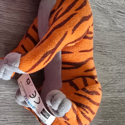 Disney kosedyr tiger i oransje og grått stoff. Myk plysjfigur med trykte tigerrender og broderte detaljer i ansiktet. Egnet som leke eller kosebamse for barn. CE-merket i henhold til gjeldende sikkerhetsstandarder for leker.Dette kosedyret er en plysjfigur av tigeren Shere Khan fra Disneys Jungelboken.