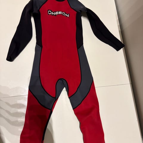 Oneeon Junior våtdrakt i hel lengde i svart og grått. Drakten har lange ermer og lange ben, med glidelås i ryggen for enkel av- og påkledning. Egnet for barn/junior til bruk ved bading, vannsport og andre aktiviteter i vann der det er behov for ekstra isolasjon. Materialet er typisk elastisk neopren som gir bevegelsesfrihet og beskyttelse mot kaldt vann. Som ny.