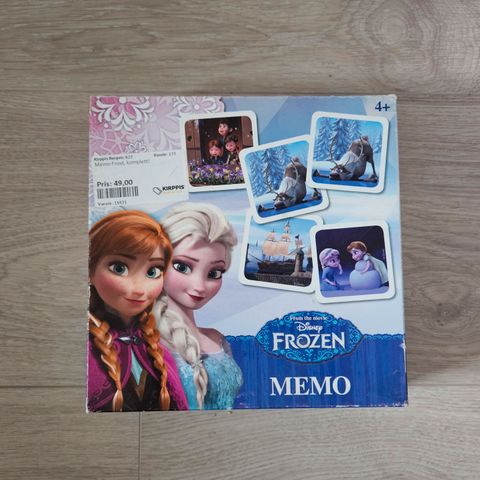 Disney Frozen memo spill med 48 brikker. Spillet består av kvadratiske kort med motiver fra filmen Frost, inkludert flere av figurene. Memo-spill passer for barn fra 3 år og oppover, og kan spilles av to eller flere spillere. Formålet er å trene hukommelse ved å finne og samle like par blant kortene som legges med bildesiden ned på bordet.