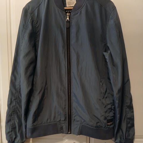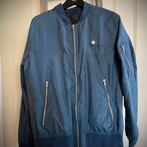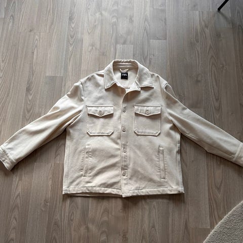 Zara jakke for herre i størrelse L. Jakken er blå og laget i linmateriale. Den har glidelås foran og glidelåslommer i sidene. Modellen har ribbekanter nederst og ved ermene, samt enkel krage uten hette. Passer som lett ytterjakke i mildt vær.