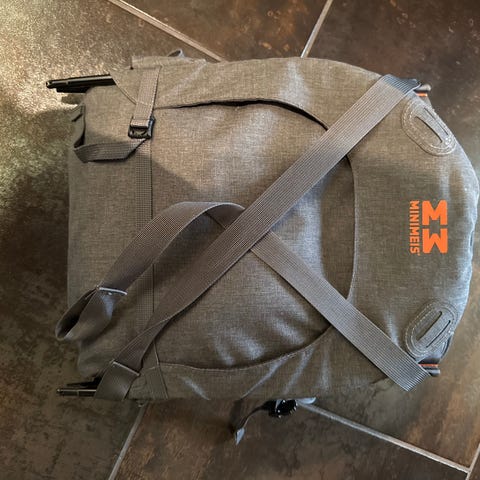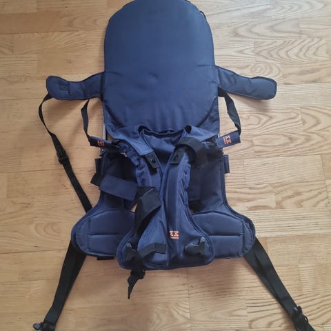 Minimeis for barn i blå og oransje farge. Minimeisen har polstrede skulderstropper og hoftebelte for bedre bærekomfort. Justerbare stropper gir mulighet for tilpasning til bærer. Minimeisen har sammenleggbart stativ med «pull to fold»-funksjon for enkel opp- og nedfelling. Egnet for turer og hverdagsbruk der barnet bæres på skuldrene.