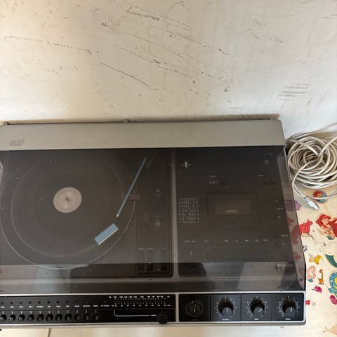 Platespelar, radio og kasettspelar frå 1986. Ikkje vore i bruk på mange år, så veit ikkje kva som fungerar lenger. Må hentast.