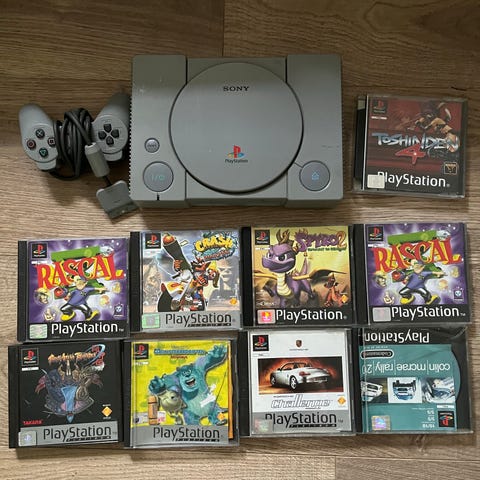 Bildene viser tilhørende kablet håndkontroller og tilkoblingskabler (AV-kabler). Det følger også med PlayStation spill i esker, som vist på bildet.