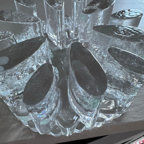 Flott og tung telysholder/tekannevarmer i klart krystallglass, trolig fra tyske Glasdesign Georgshütte, men klistremerket er tatt av (som det skal)