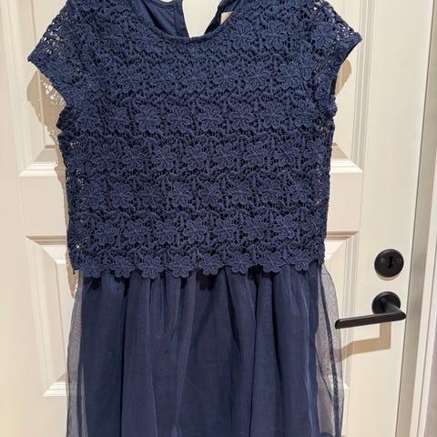 Lindex Holly & Whyte kjole for jente i størrelse 164. Kjolen er blå og laget i polyester. Overdelen har kort erm og er i blonde-/heklet struktur, mens skjørtedelen har lett, transparent ytterstoff med underkjole. Rund hals og knepping bak i nakken. Passer til bruk ved anledninger som selskap, konfirmasjon eller andre formelle og uformelle sammenkomster.