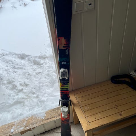 K2 alpinski med bindinger i rød og blå farge. Lengde 124 cm.