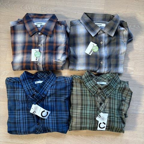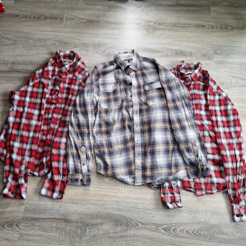 4 nye skjorter i rutete flerfarget mønster i størrelse L. Skjorten har klassisk krage og knepping i front. Passer til hverdagsbruk eller fritid, og kan brukes alene eller over t‑skjorte. Flerfarget rutemønster gir et variert uttrykk som kan kombineres med både jeans og chinos. Nypris: 2200kr, selges samlet for 299kr.