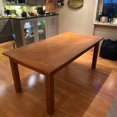 Solid, pent bord med 1 liten skuff og 2 plater a 50 cm. Bordet har en skade i platen, som enkelt kan repareres.