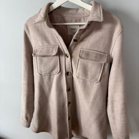 Skjorte jakke for dame i beige farge. Jakken er i viskose og oppgis som one size. Modellen har krage, knappelukking i front og to påsydde lommer foran. Stoffet har en lett ribbestruktur. Veldig myk og god.