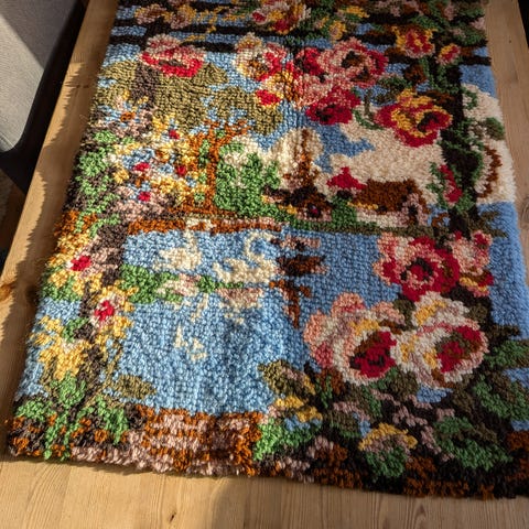Teppe til gulv eller vegg. Er ikke løpegang til oppheng nå. Veldig pent brukt.