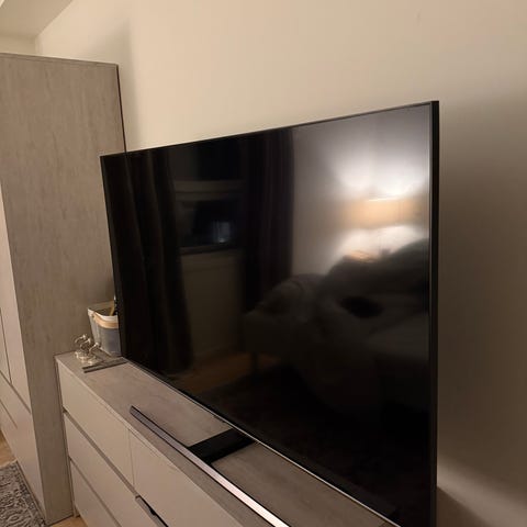 Veggmontert TV (har fot også) som egner seg for streaming, titting og tilkobling av eksterne enheter via tilgjengelige innganger. Smart-TV-funksjoner gir tilgang til ulike apper og strømmetjenester direkte.
