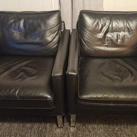 Selger to fine, brune skinn stoler. Ikke noen synlige skader på stolene og sitter mykt og godt.