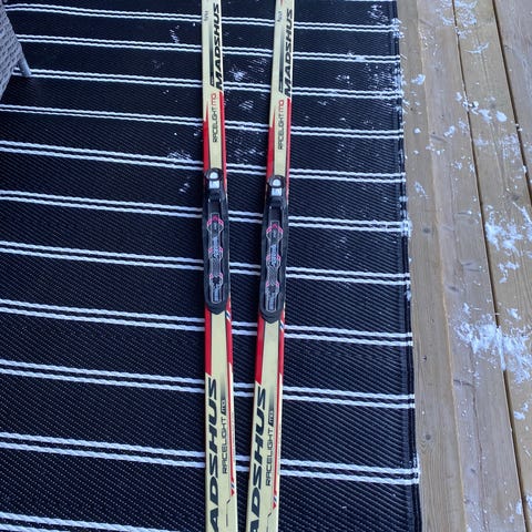 Eldre Madshus Dinc langrennsski i rød NNN binding. Et eldre par Swix staver i 70 cm kan følge med hvis ønskelig.