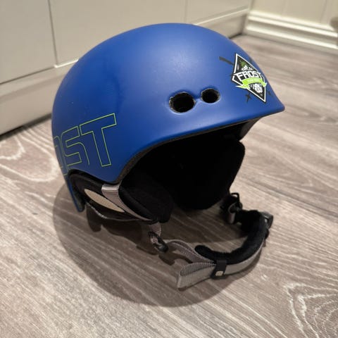 Frost alpinhjelm med tilhørende skibriller. Hjelmen er blå med grafikk på sidene og har justerbar størrelse bak. Skibrillene har mørke glass og grønn ramme, festet med elastisk Frost-stropp rundt hjelmen. Innvendig polstring og hakestropp med spenne gir stabil passform. Egnet til alpint og annen vintersport for barn eller ungdom, avhengig av størrelseangivelse på hjelmen. Selges samlet. Mye bruk igjen, brukt av 1 gutt fra ca 5 års alder til 12 års alder.