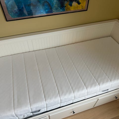 IKEA enkeltseng med skuffer i hvit utførelse. Sengen har ribbebunn i tre og integrerte oppbevaringsskuffer under liggeflaten. Egnet som enkeltseng til soverom, barnerom eller gjesterom. Madrass følger med.