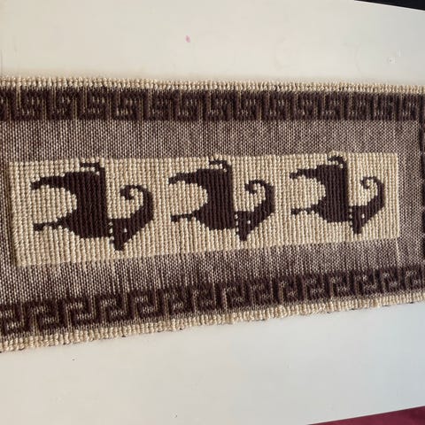 Søkeord: broderi, brodert, klokkestreng, åkle, klostersøm, teppe, billedvev, veggteppe, ull, redesign, retro, rustikk, gobelin, tekstil, middelalder, ridder, smijernsbeslag, tradisjon, håndlaget, hjemmelaget, husflid, tekstilkunst, festdrakt, bunad