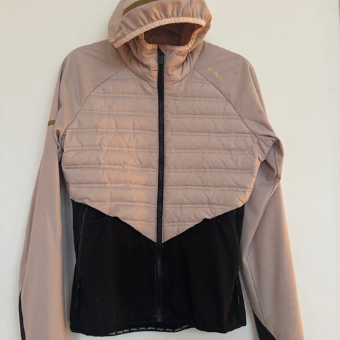 Kari Traa jakke for dame i størrelse M. Jakken er flerfarget med lyse og mørkere beige felt, sorte partier og rosa detaljer. Materialet er polyester med vatterte paneler foran og bak for ekstra isolasjon. Modellen har hette, hel glidelås i front og elastisk kant nederst. Egnet som lett ytterjakke eller mellomlag til hverdagsbruk og ulike utendørsaktiviteter.