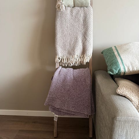 Hjemmestrikket pute i ull med sintetisk pute. Pled tror jeg er i bomull.