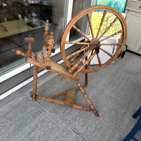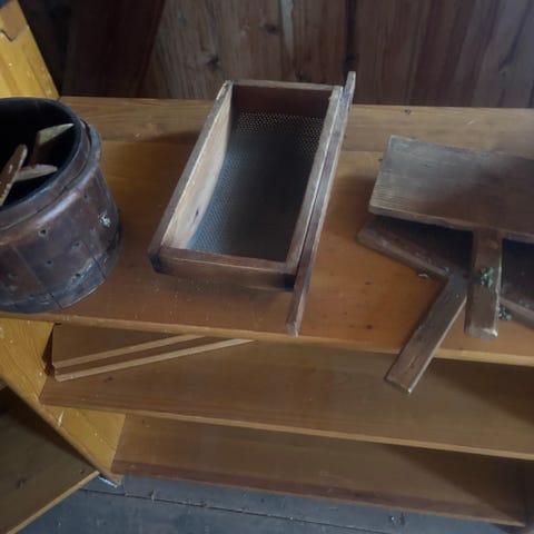 Samling med gammeldagse kjøkken- og husholdningsredskaper i tre og metall. Bildene viser blant annet en gammel rok, vaskebrett, tønne, kaffekvern, treskåler og dekorerte fat. Gjenstandene kan brukes som dekor, rekvisitter eller samlerobjekter. Materialene er hovedsakelig tre og metall, med håndmalte detaljer på noen av fatene.
