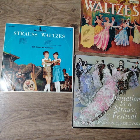 Samling, 4 stk., med klassiske musikk-LP-plater med fokus på Strauss og wienervals. Platene inkluderer blant annet utgivelser som «Zwei Herzen im Dreivierteltakt», «The Blue Danube» og andre innspillinger av Strauss-melodier og wienervals. Format: LP (vinyl). Sjanger: klassisk, orkestermusikk, vals.