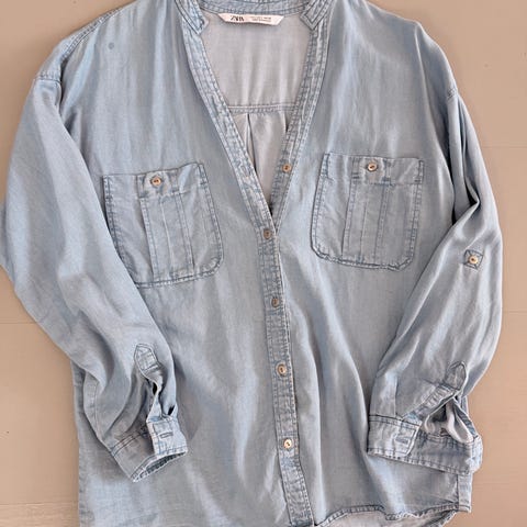 Zara skjorte for dame i beige farge. Skjorten er S size og laget av polyester. Modellen har klassisk krage, knappelukking foran og lange ermer med mansjett og knapp. Passer til hverdagsbruk eller som en lett overdel over annet tøy.