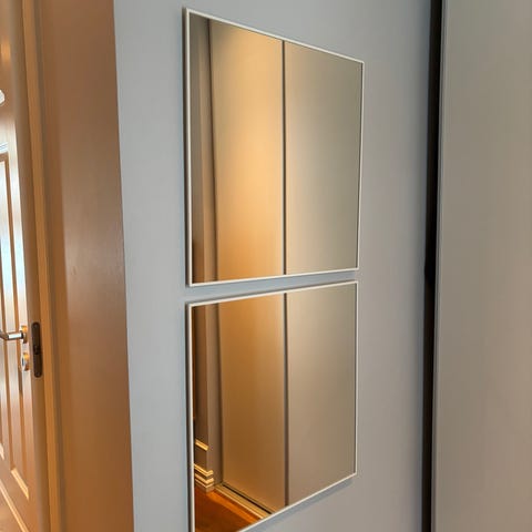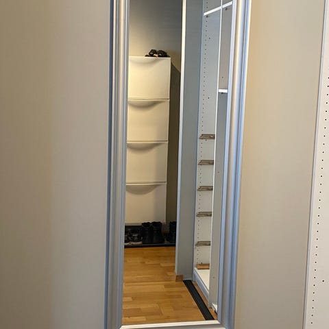 IKEA speil i helfigur med hvit ramme. Rektangulær form, egnet for montering på vegg. Passer godt i gang, soverom eller garderobe for å se antrekk i full høyde. Rammen er smal og nøytral i uttrykket, og speilet gir et enkelt og funksjonelt preg i rommet.