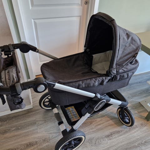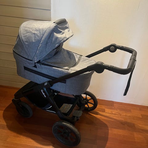 Pent brukt til to barn. Vært lagret innendørs hele tiden. Følger med ergonomisk sittedel, bagdel, myggnetting og tinkafu regntrekk.