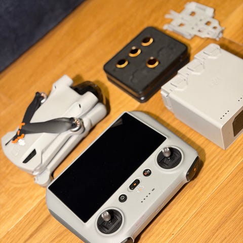DJI Mini 2 drone med tilhørende fjernkontroll og skulderveske. Dronen er sammenleggbar og kompakt, egnet for transport i medfølgende veske.