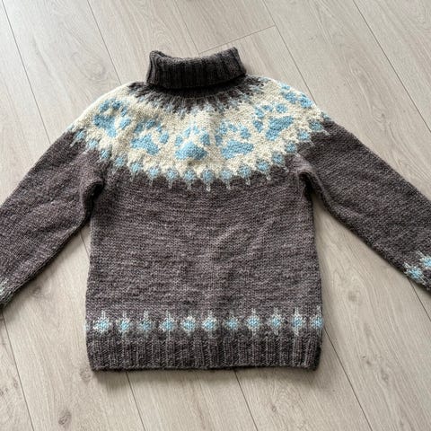 Villmarksgenser som er lite brukt. Strikket til dame i ca størrelse M. Genseren har ligget sammen brettet derfor bare noen merker på genseren etter dette men regner med de går vekk ved bruk. Selges for 1500 kr.