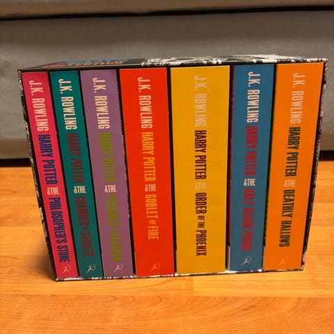 J.K. Rowling Harry Potter The Complete Collection bokboks med alle sju bøkene i serien på engelsk. Settet inneholder pocketutgaver samlet i en eske med illustrert omslag. Bøkene følger Harry Potters historie fra første til syvende bok i originalspråket. Egner seg for lesere som ønsker hele serien samlet i én boks. Selger også hele serien på norsk