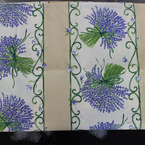 Bordløper med grønt og hvitt rutemønster og trykk av kaniner, blomster og sommerfugler langs kantene.